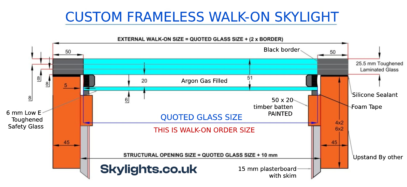 Unrivalled safety performance and tested to the most rigid industry standards Minimum 25.5mm Component Laminated Glass Clear Glass or Privacy/Frosted For internal or external use All our Walk-on products are bespoke and made to your exact size requirements Best Price 20 Years Warranty Guarantee Payment Safety Self Cleaning Clear, Green or Blue Tint UV Protected Free Delivery within London (M25) Аll Glass Panels Safety Toughened and Laminated Glass Made In EU London Based Stock Quick and easy installation Step By Step Installation Guide 24/7 technical helpline📏 Walk-On Skylight Cost – Instant Quote for Custom Sizes