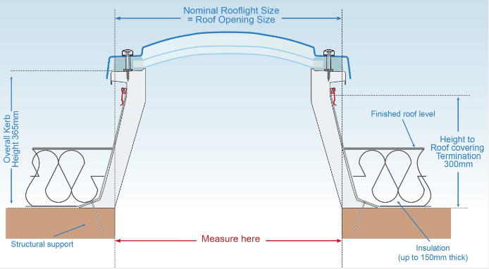 For mounting at roof surface level, providing 150mm of waterproofing height (exact kerb profile varies with specification)