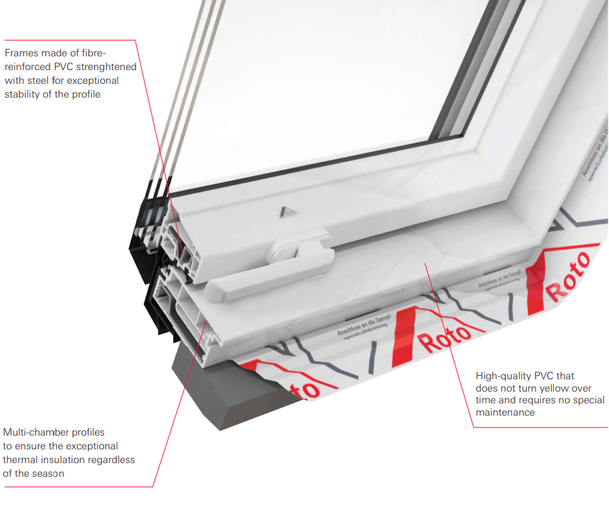 Unlike many other PVC skylights in the market, Roto Designo models are crafted from solid 100% PVC, ensuring unmatched durability. The multi-chamber profiles of our skylights provide exceptional energy and acoustic insulation, enhancing both energy savings and living comfort.